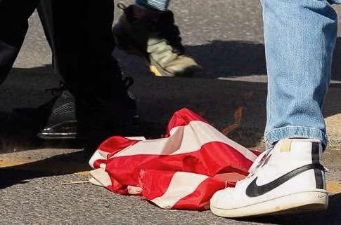 Defenders of the 1st amendment demonstration were rammed with wheel chairs, accosted and screamed at for wearing masks to protect their health and their anonymity. Comrades were spit on and were threatened. The flag still burned.